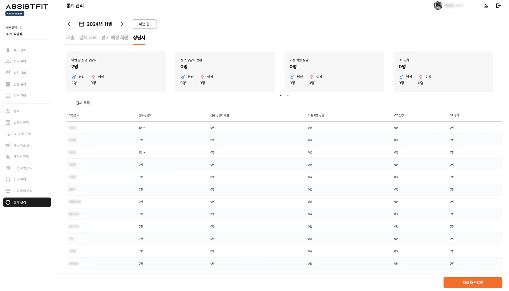 이번 달 신규 상담자, 신규 상담자 전환, 기존 회원 상담, OT 진행, OT 성과