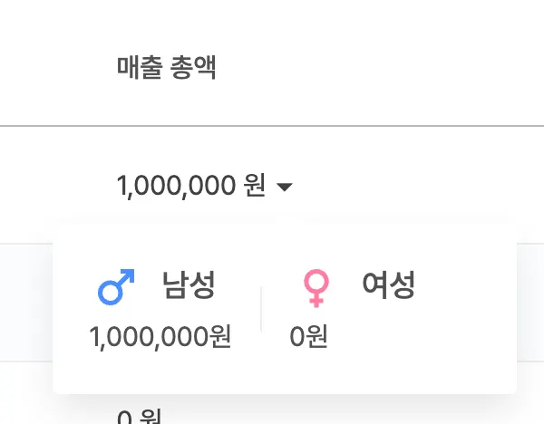 금액 오른쪽 화살표에 마우스를 올려놓으면 성별에 따른 통계를 확인할 수 있어요.
