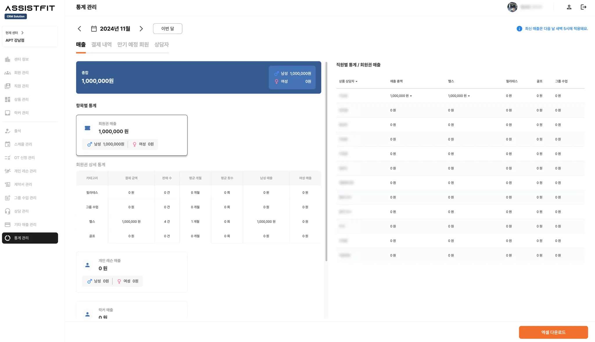 각 항목에 대해 직원별로 통계를 조회할 수 있어요.