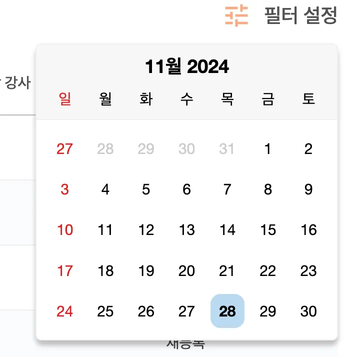 날짜는 우측 ‘필터 설정’을 통해 조회할 수 있어요.