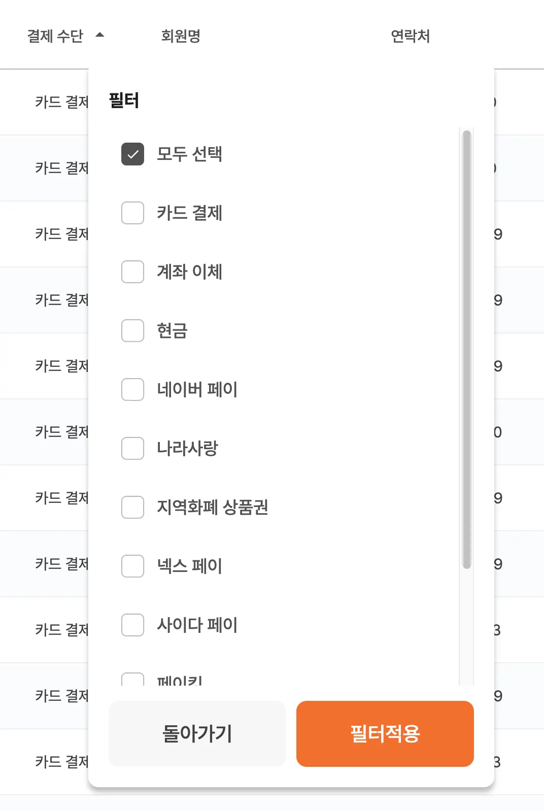 적용 항목: 상품 유형, 결제 수단, 상품 상담자, 신규 재등록