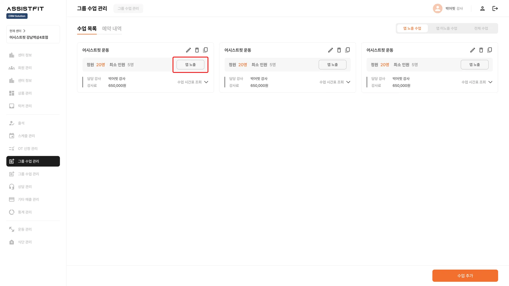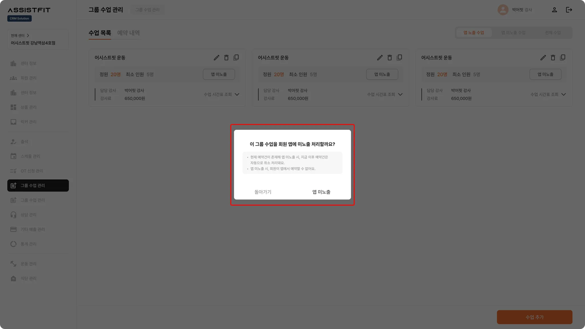 반대로, 앱 미노출 처리를 할 경우 회원앱에 수업 카드가 노출되지 않고 회원이 예약을 할 수 없어요.
