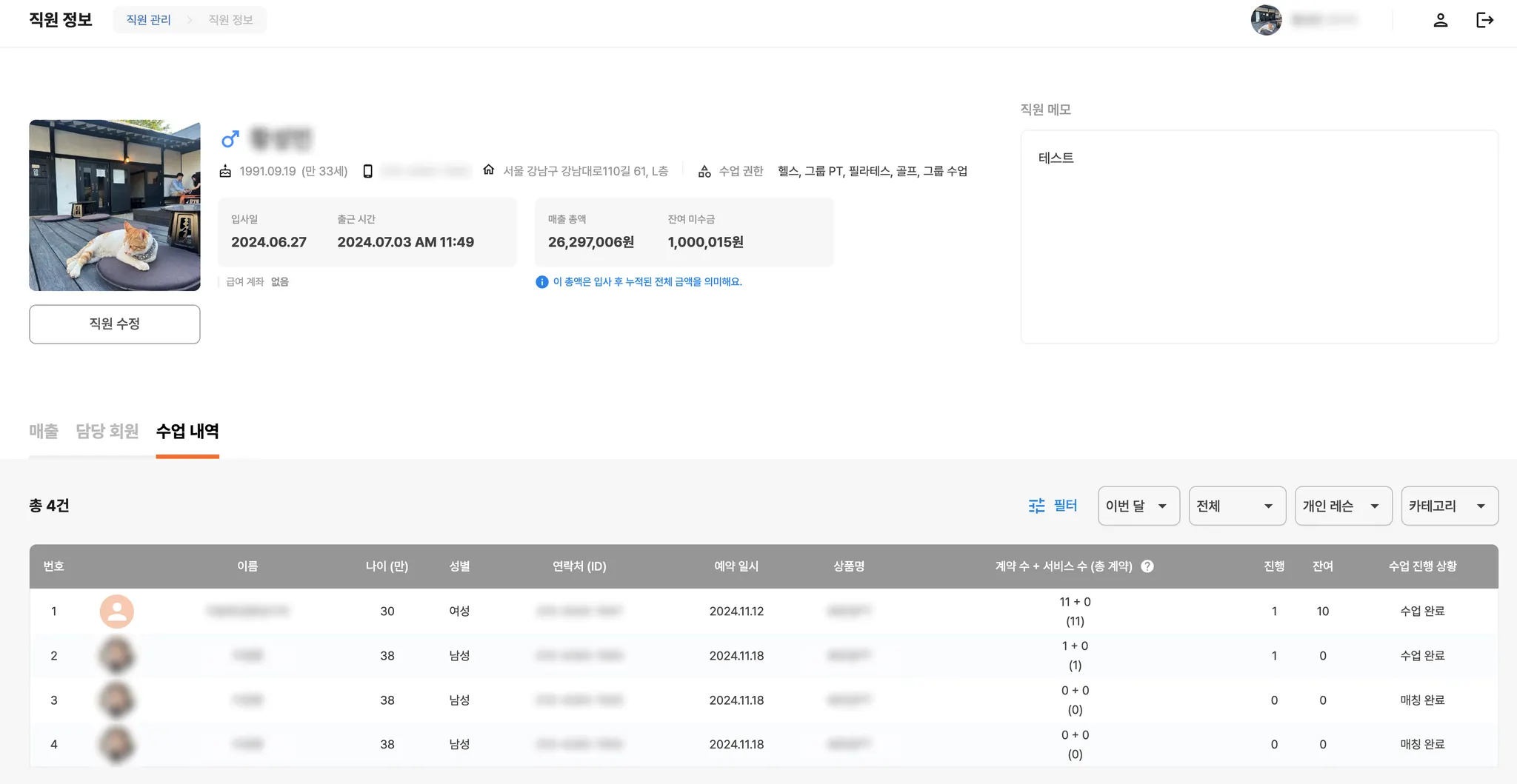 직원이 진행한 수업 내역을 확인할 수 있어요.