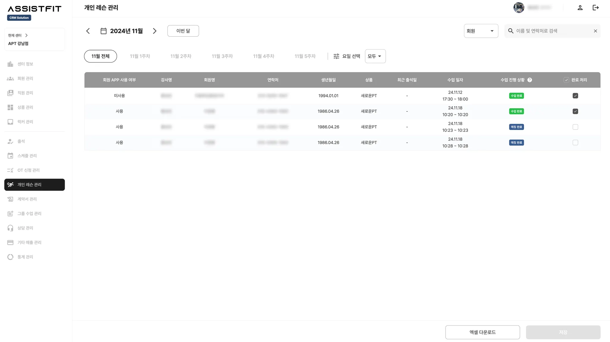 센터에서 진행하는 개인 레슨을 관리하고, 완료 처리가 필요한 수업에 대해 승인 처리를 할 수 있어요.