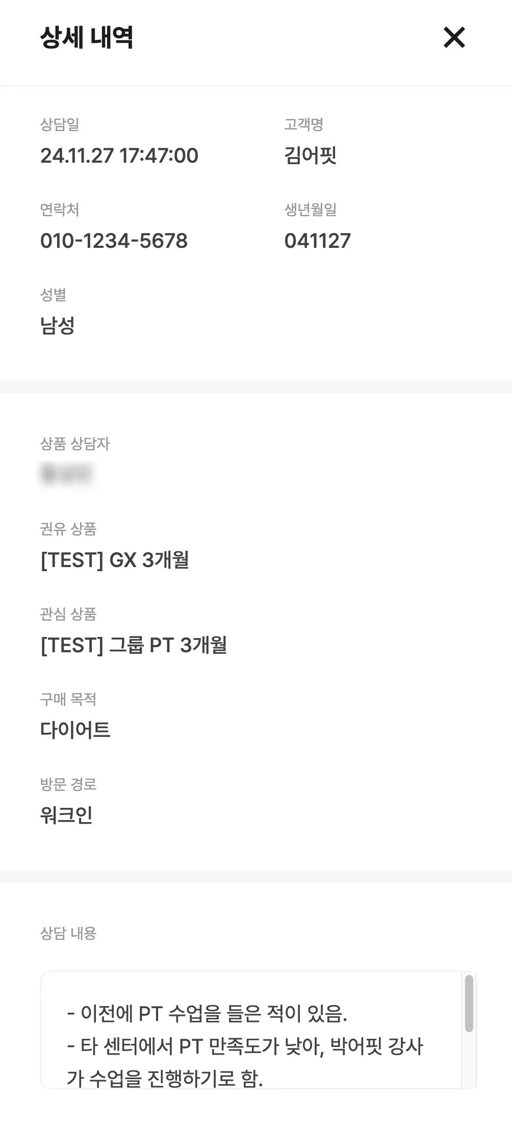 상담을 진행한 고객의 개인정보를 확인할 수 있어요.